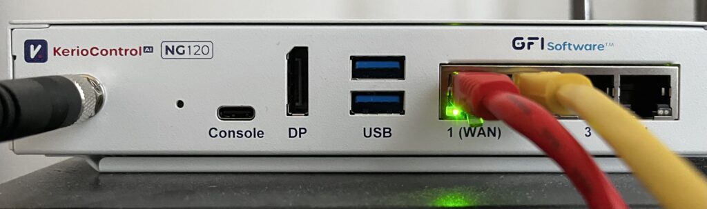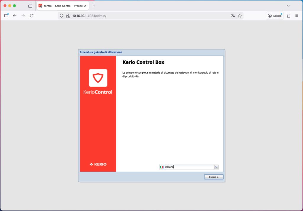 Per la prima configurazione è consigliato collegarsi con un computer direttamente a una delle porta LAN, ad esempio alla porta 2. L’IP di default dell’interfaccia LAN del Kerio Control è il 10.10.10.1.