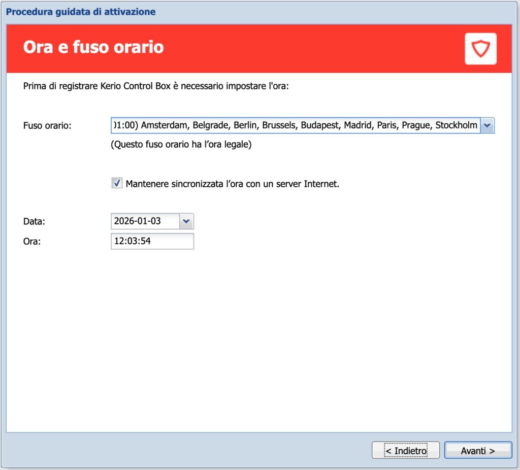 Se l’NG120 si connette con successo a Internet sarà aggiornata la data e l’ora di sistema e sarà sufficiente verificare che il fuso orario sia corretto prima di proseguire: