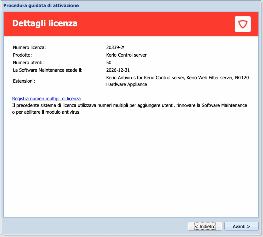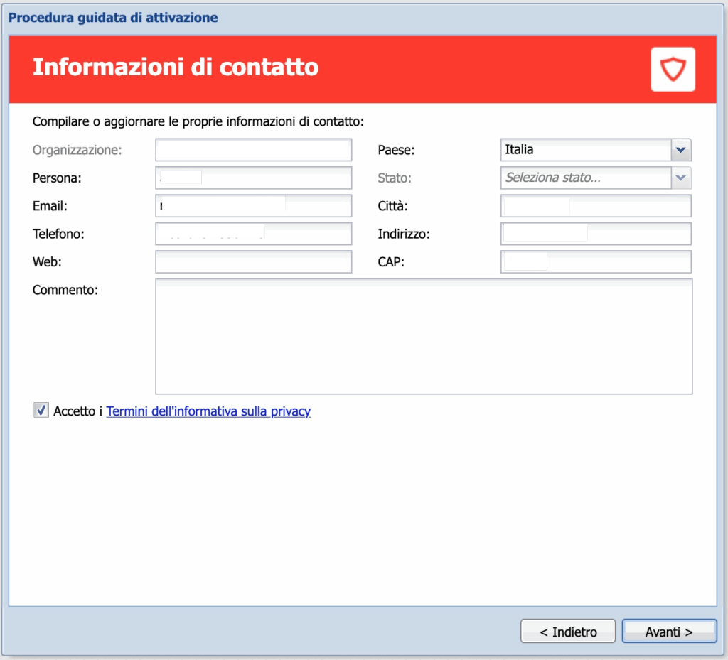 Inseriamo o aggiorniamo i dati di registrazione della licenza:
